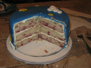 See how the fondant sagged over the clouds in the border? Shameful. The cake is my favorite Magnolia Bakery Vanilla cake with chopped up strawberries added. The strawberries released some of their juices and made it nice and dense and moist. The frosting is standard American buttercream, which is so amazingly, teeth-numbingly sweet.And here is Erich's little cake. A bit of eating out of the top and a lot of poking the sides with his fingers.
